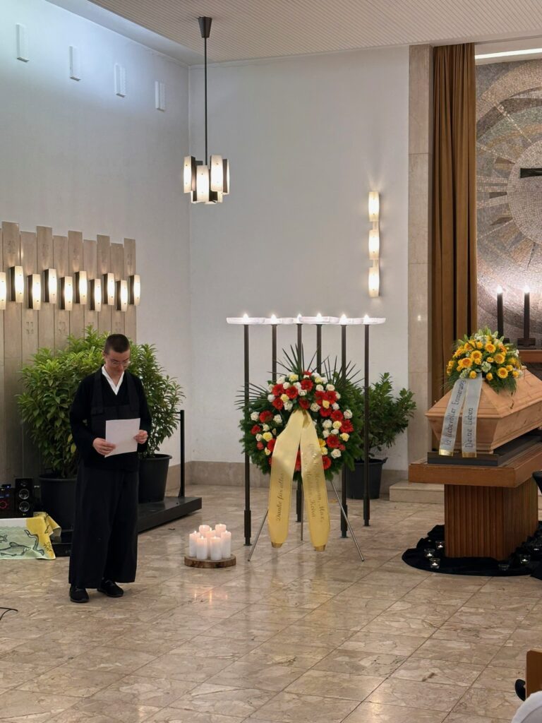 Jemand, der dir viel bedeutet, ist krank oder vor kurzem verstorben? Auf unserem Altarstehen rechts neben Buddha kleine Papierkarterl mit den Namen von Kranken. Sie bleiben dort, bis sich der Zustand der Person wieder ändert. Links stehen die Namen derVerstorbenen, die für 49 Tage dort verbleiben. Ein-bis zweimal pro Woche rezitieren wir das „Dai Hi Shin Dharani“ und widmen unsere Praxis allen Kranken und Verstorbenen.Kontaktiere uns, wenn du jemanden auf den Altar stellen lassen möchtest. Wir raten dir jedoch, dich vorher zu versichern, dass dies auch im Sinne der betroffenen Person ist.